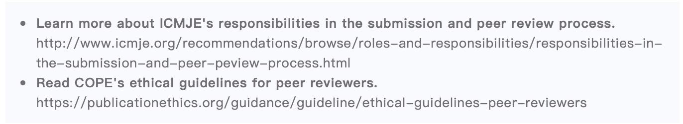 《柳叶刀》系列期刊遵循国际医学期刊编辑委员会(ICMJE)发布的《学术研究实施与报告和医学期刊编辑与发表的推荐规范》(ICMJE推荐规范)关于同行评议的最佳实践指南,并支持国际出版伦理委员会(COPE)关于同行评议专家的伦理准则。我们的编辑均为ICMJE和COPE成员。