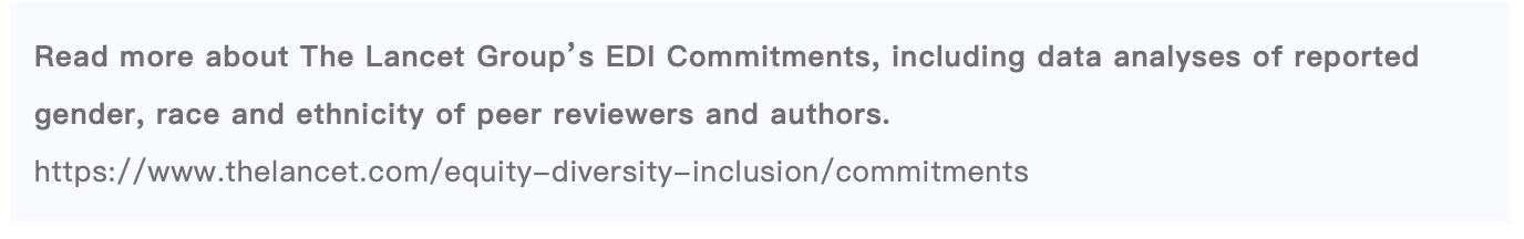 《柳叶刀》系列期刊致力于提升研究与出版领域的公平性、多样化和包容性,包括审稿人在人口统计学上的多样化。一些期刊还邀请有相关经历的人士参与同行评审(如《柳叶刀-精神病学》)。