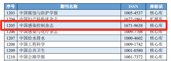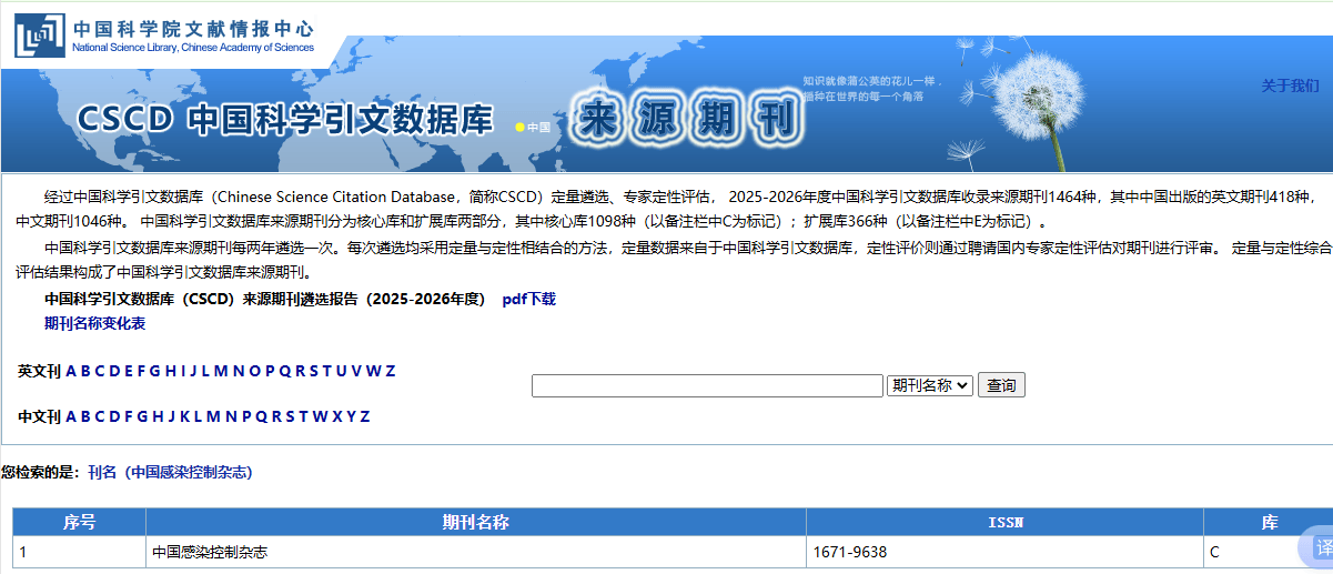 2025年8月,中国科学院文献情报中心发布中国科学引文数据库(Chinese Science Citation Database,CSCD)来源期刊列表(2025–2026年度),《中国感染控制杂志》再次入选CSCD核心库来源期刊。自2019年本刊进入CSCD以来,这是连续第4次进入CSCD。