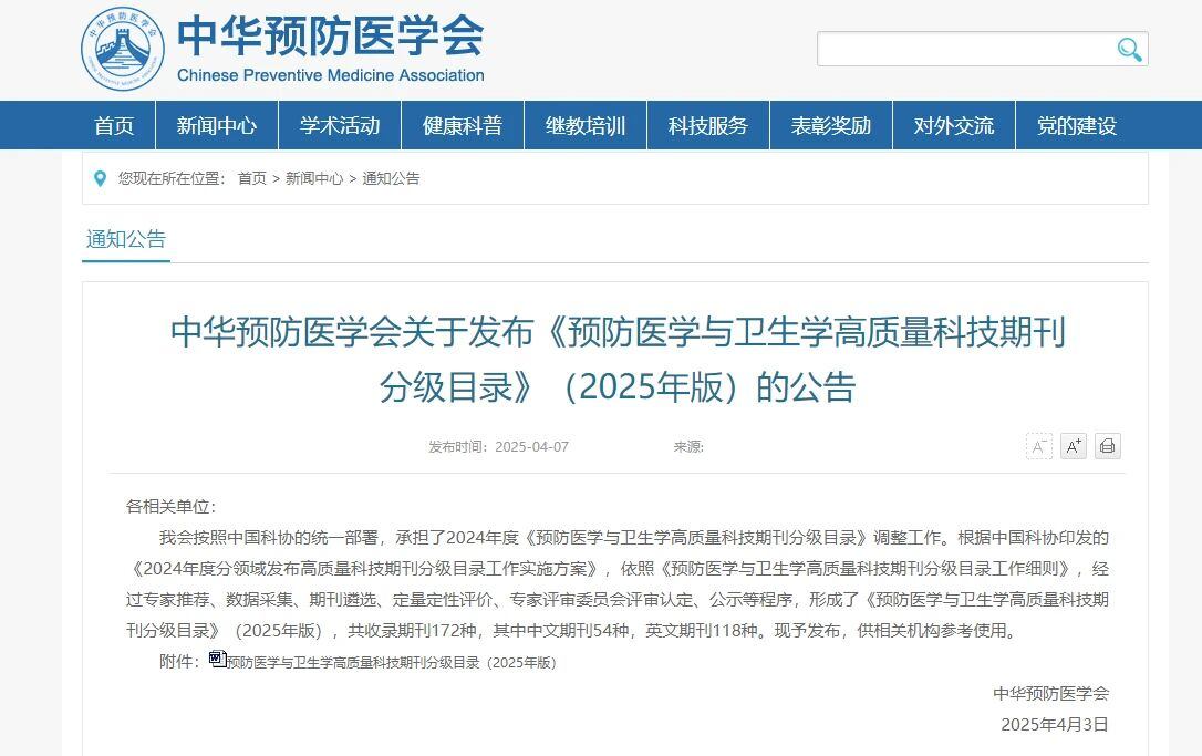 中华预防医学会按照中国科协的统一部署,根据中国科协印发的《2024年度分领域发布高质量科技期刊分级目录工作实施方案》,依照《预防医学与卫生学高质量科技期刊分级目录工作细则》,经过专家推荐、数据采集、期刊遴选、定量定性评价、专家评审委员会评审认定、公示等程序,形成了《预防医学与卫生学高质量科技期刊分级目录》(2025年版),共收录期刊172种,其中中文期刊54种,英文期刊118种。