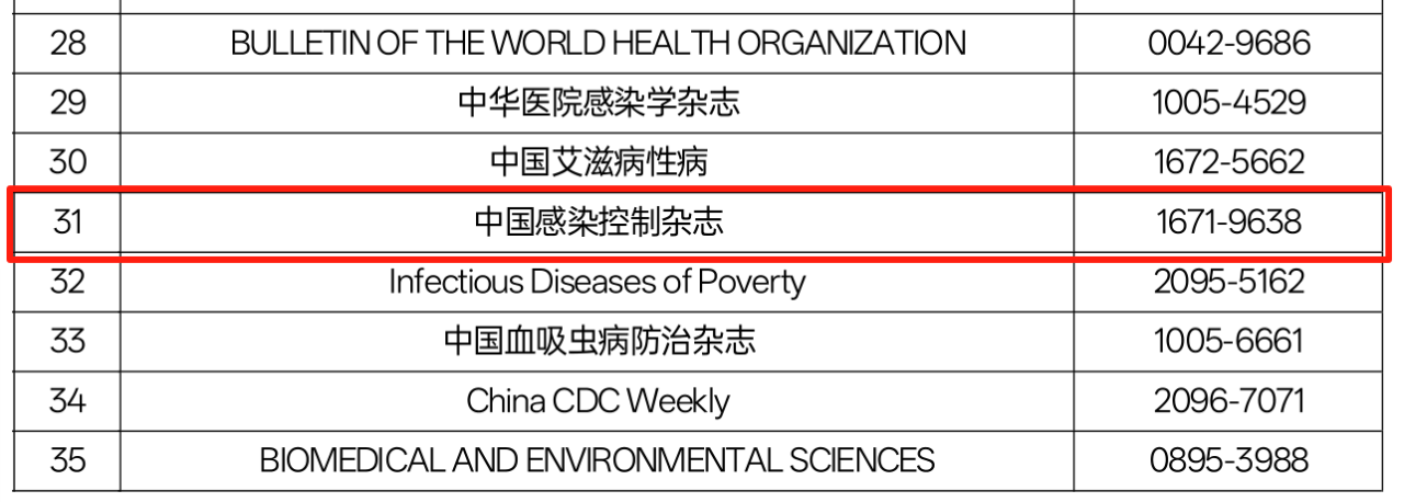 2025年4月,中华预防医学会发布《预防医学与卫生学高质量科技期刊分级目录》(2025年版),《中国感染控制杂志》再次入选为预防医学与卫生学领域高质量科技期刊分级目录T1级。这是自2021年开评以来,本刊第二次再次入选T1级。