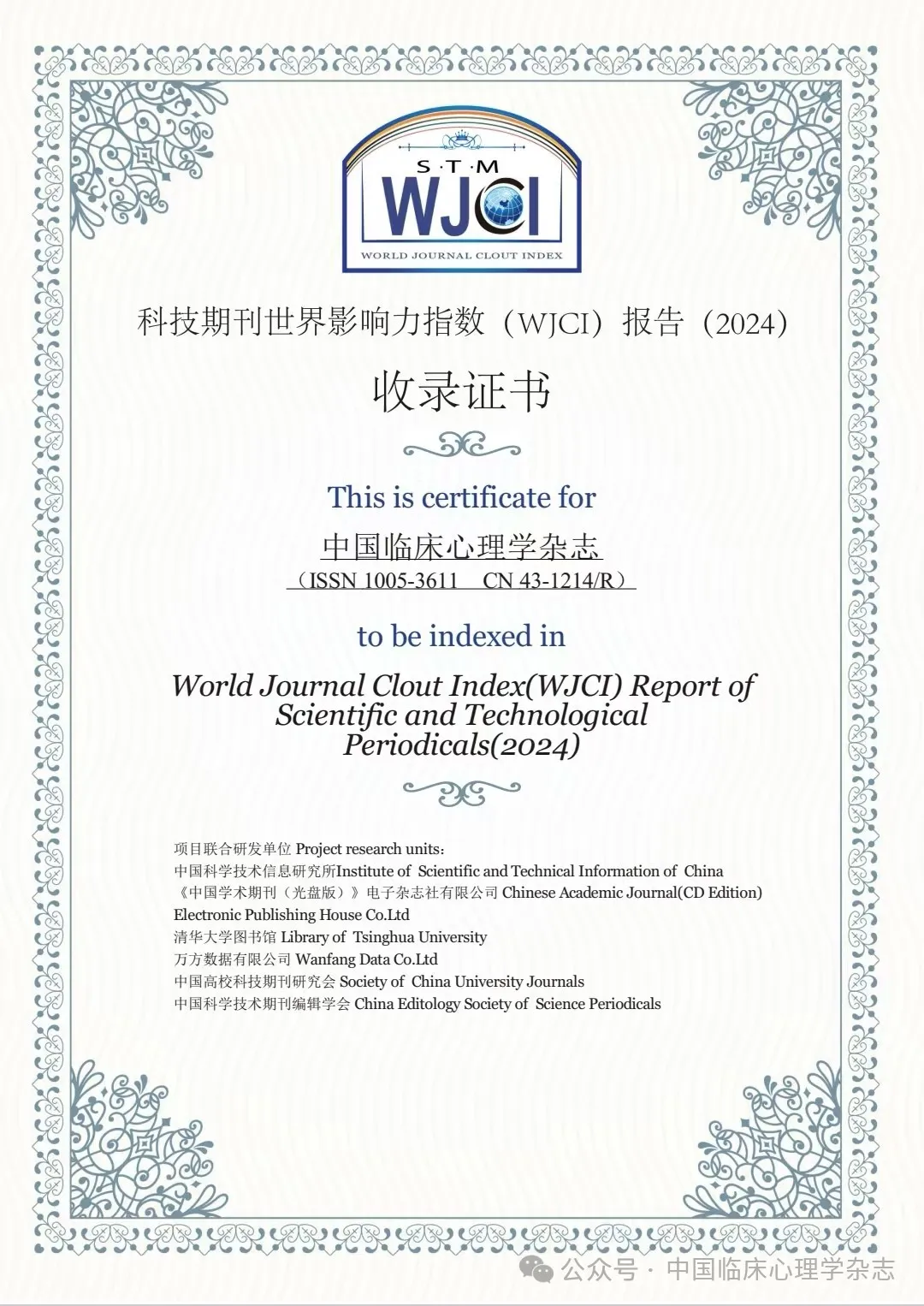 2.《中国临床心理学杂志》被“科技期刊世界影响力指数(WJCI)报告(2024)”收录
