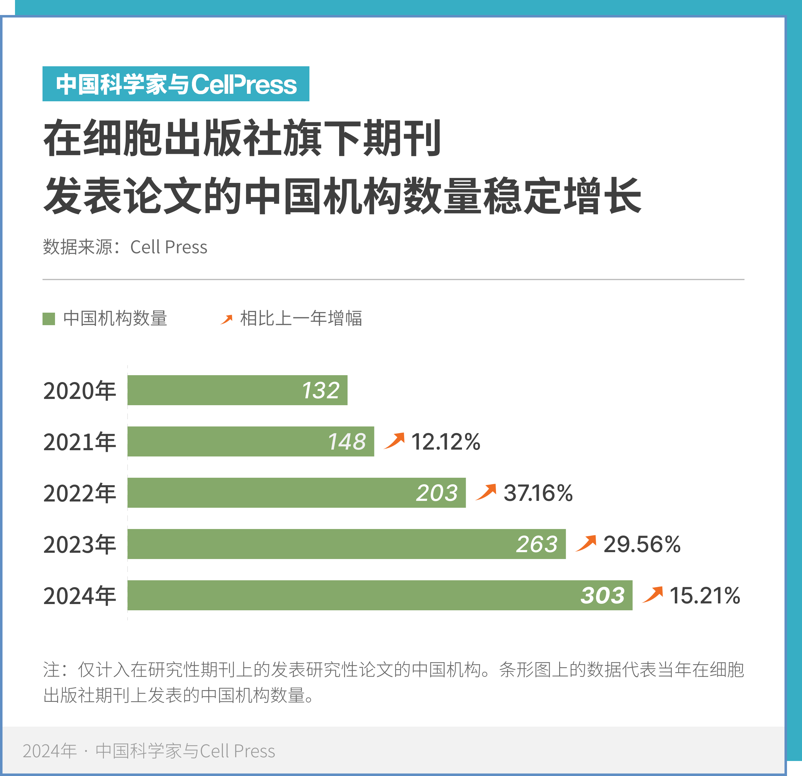 2024 年,中国学者研究产出数量持续提升,以中国机构为第一完成单位、发表在 Cell Press 细胞出版社旗下研究型期刊上的研究性论文数量继续快速增长,总发文量达到 2446 篇,较上一年增加了 17.6%,是 2020 年发表量的近 4 倍。