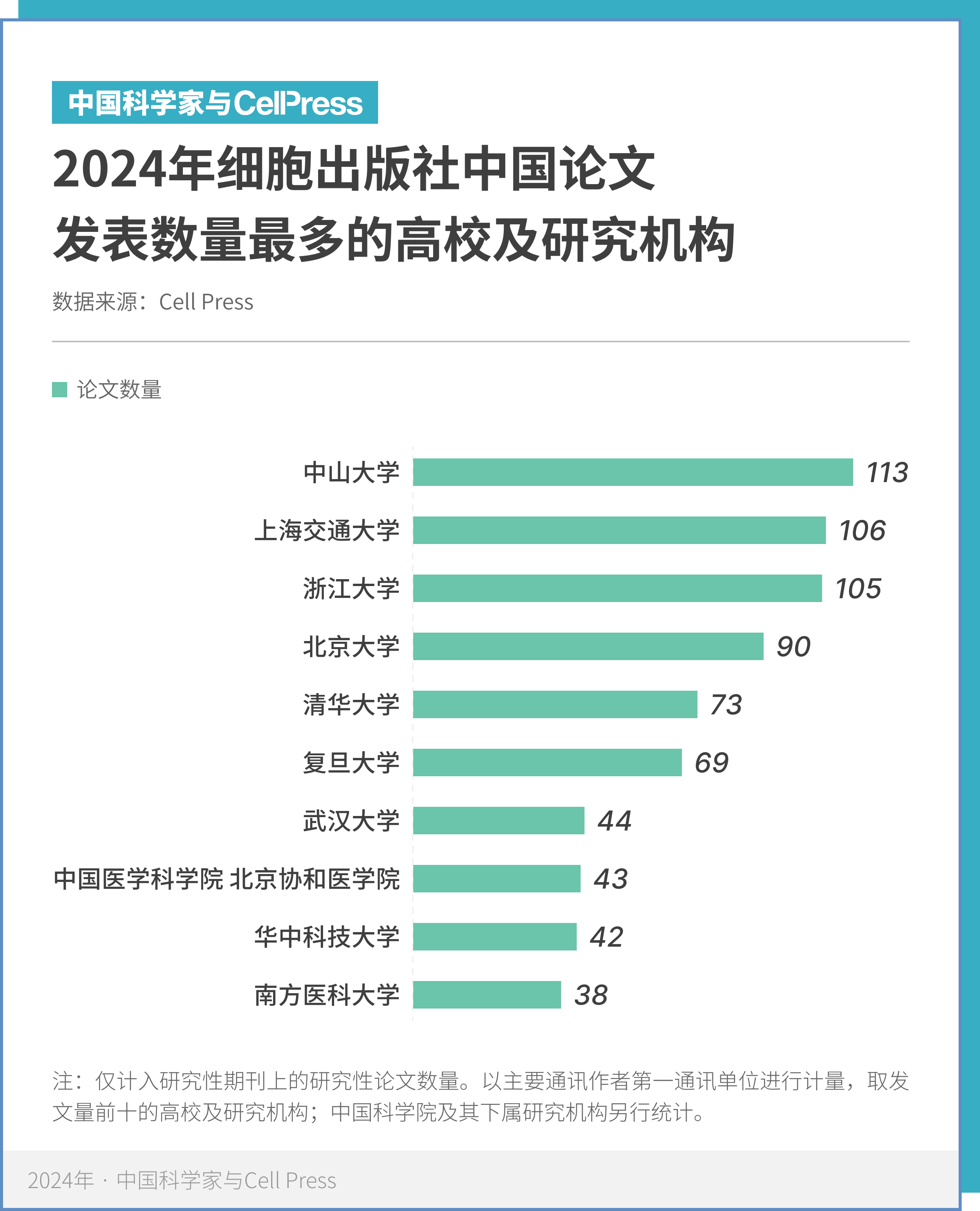 从机构分布来看,各大高校继续保持高水平科研产出。其中,中山大学以 113 篇位列发表量第一,上海交通大学以 106 篇的发表量位列第二,浙江大学以 105 篇位列第三;北京大学、清华大学、复旦大学、武汉大学、中国医学科学院北京协和医学院、华中科技大学和南方医科大学分别位列第四到第十。