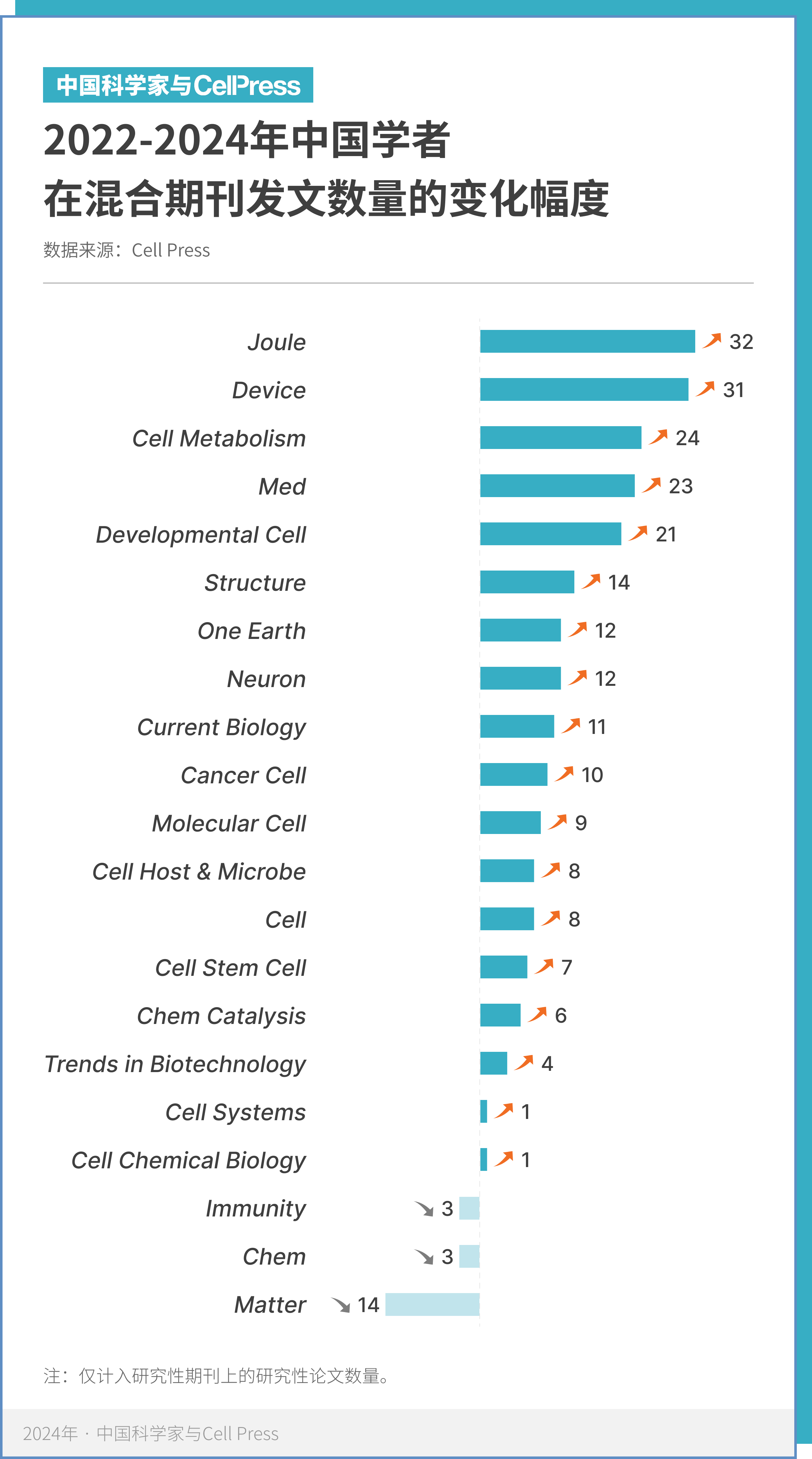 科学的高速发展离不开高质量学术期刊提供的展示舞台。2024 年,细胞出版社旗下共有 18 本混合型期刊(hybrid journal)实现了中国论文的发表增长。其中,中国科学家在物质科学领域的两本期刊 Joule 与 Device 的发文增量最高,分别较上一年增加了 32 篇和 31 篇;在生命科学与医学领域的三本期刊 Cell Metabolism、Med、Developmental Cell 中,发文增长也都突破了 20 篇。医学期刊 Med 的中国论文数更是延续了增幅最高的势头,总发文量来到 32 篇,较上一年增加了 2.5 倍。此外,2024 年中国学者在 Cell 上发表的论文数量达到 55 篇,较上一年增加了 8 篇; 有着广泛影响力的 Neuron、Current Biology 和 Cancer Cell 中国的发文也分别增加 12 篇、11 篇和 10 篇。中国科研在各个领域全面开花,展现出了强劲的发展势头。