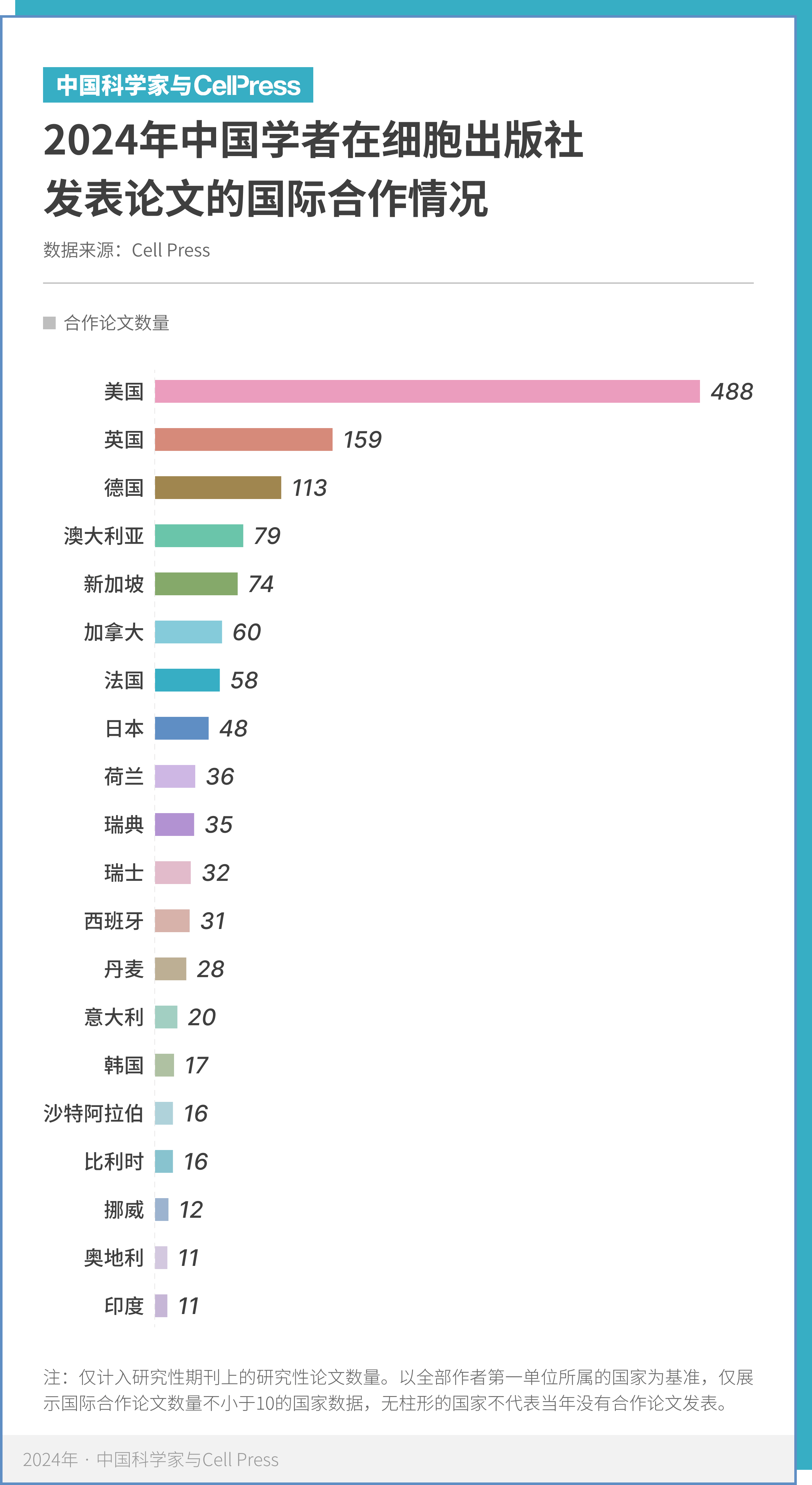 中国科研力量继续与世界各国的顶尖研究机构保持高频互动,在细胞出版社的发表记录中,国际合作论文数量稳中有升,合作网络不断拓展。