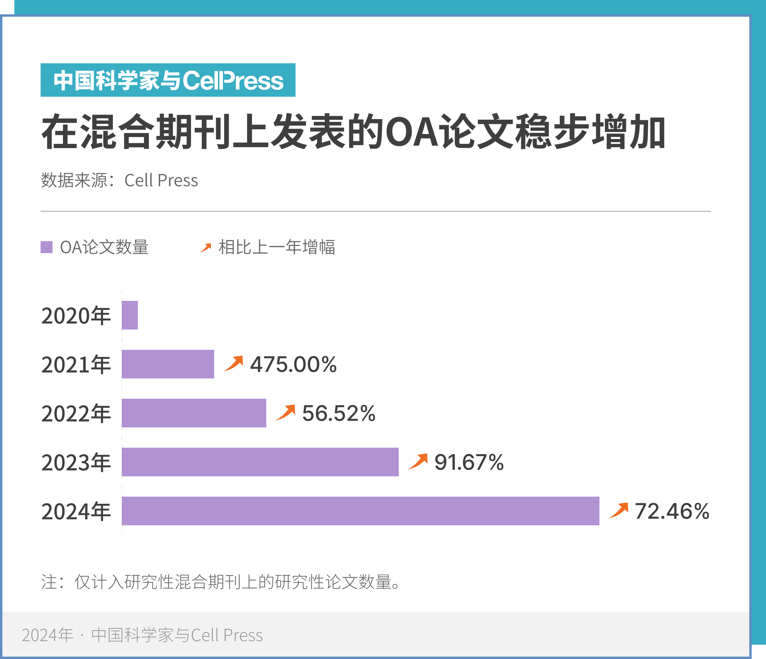 在开放科学浪潮下,混合型期刊(Hybrid Journal)的作用日益凸显。它们为研究者提供了兼顾传统订阅制与开放获取的发表路径,在平衡科研传播与学术影响力之间发挥了重要桥梁作用。2024 年,中国科学家在细胞出版社的混合型期刊上发表的 OA 论文数量稳步增加,从上一年的 69 篇增至 119 篇,增幅达到 72.5%。这种增长不仅反映出中国科研群体对开放获取理念的积极响应,也说明国内科研机构和资助体系在开放出版方面的投入不断加深。越来越多的中国研究者选择以开放的姿态参与全球学术对话,推动科研成果更高效地传播与应用。这一趋势表明,中国科研正从“高产出”迈向“高共享”“高影响”的新阶段。