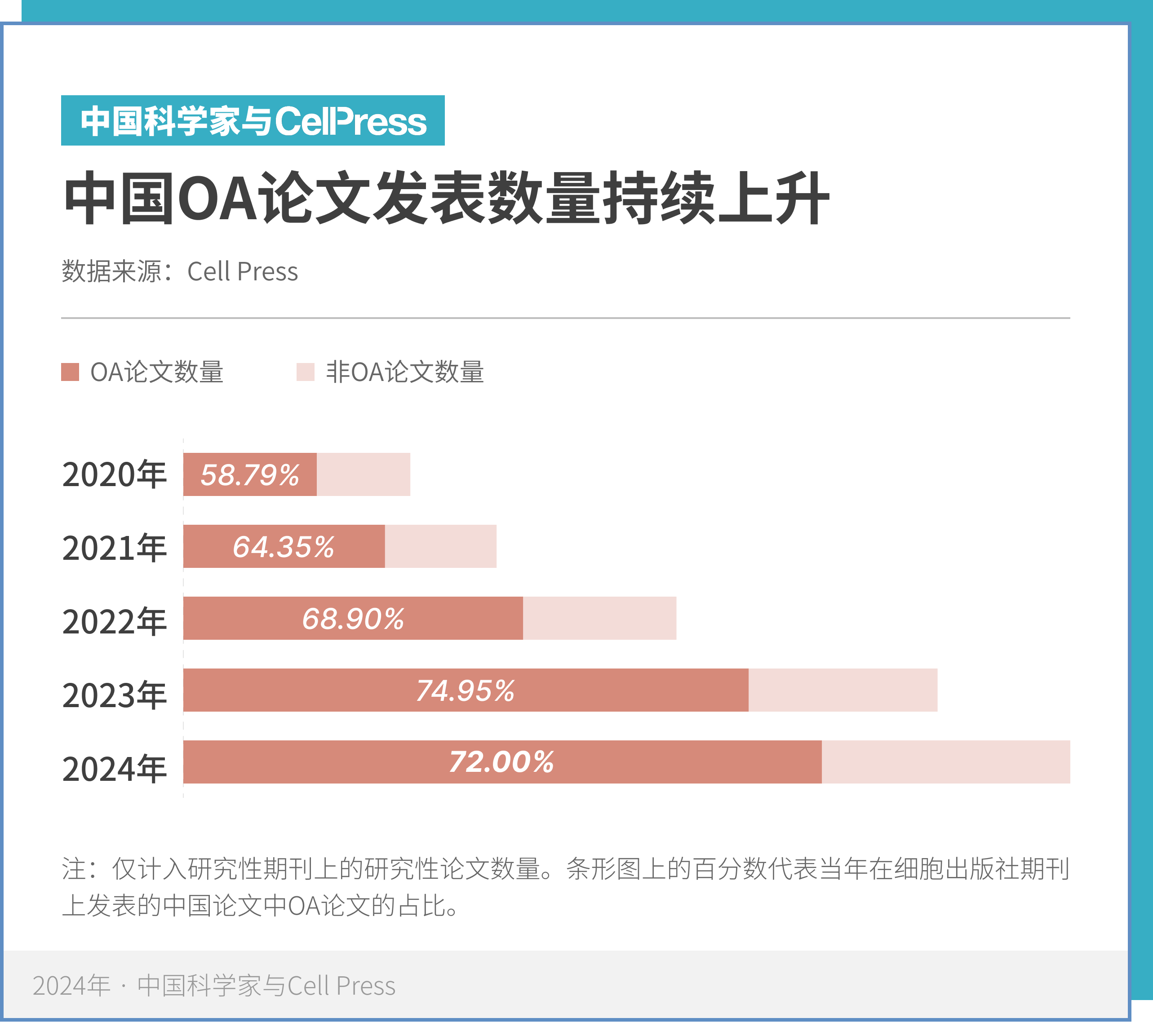 科学的开放与透明,是推动全球知识共享与合作创新的基石。2024 年,中国科学家携手细胞出版社,继续为更加透明开放的学术交流添砖加瓦:与上一年相比,中国科学家在细胞出版社期刊上以开放获取(OA)形式发表的论文数量在全部中国论文中占比接近四分之三,达到 1761 篇,较上一年增加 13%。